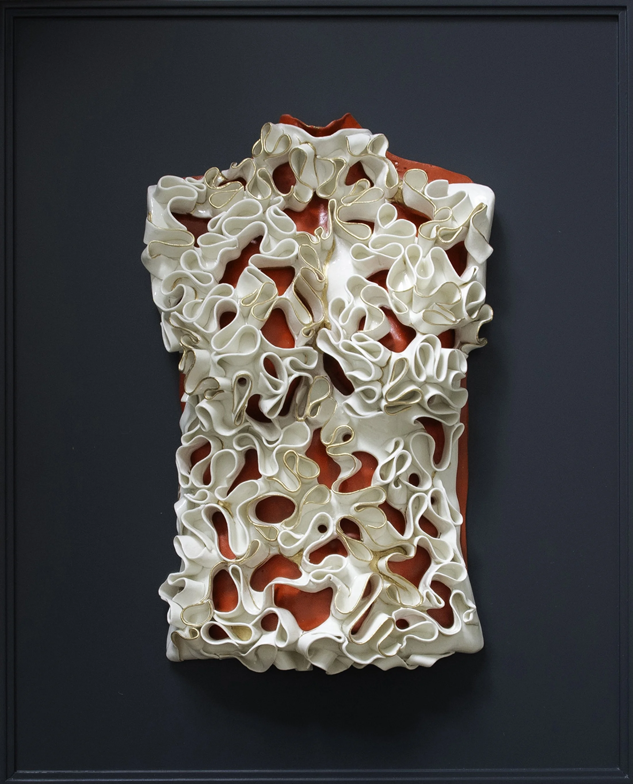 Paper porcelain and porcelain slip, with a transparent glaze, fired at 1260°C several times. Brushed with a gold lustre